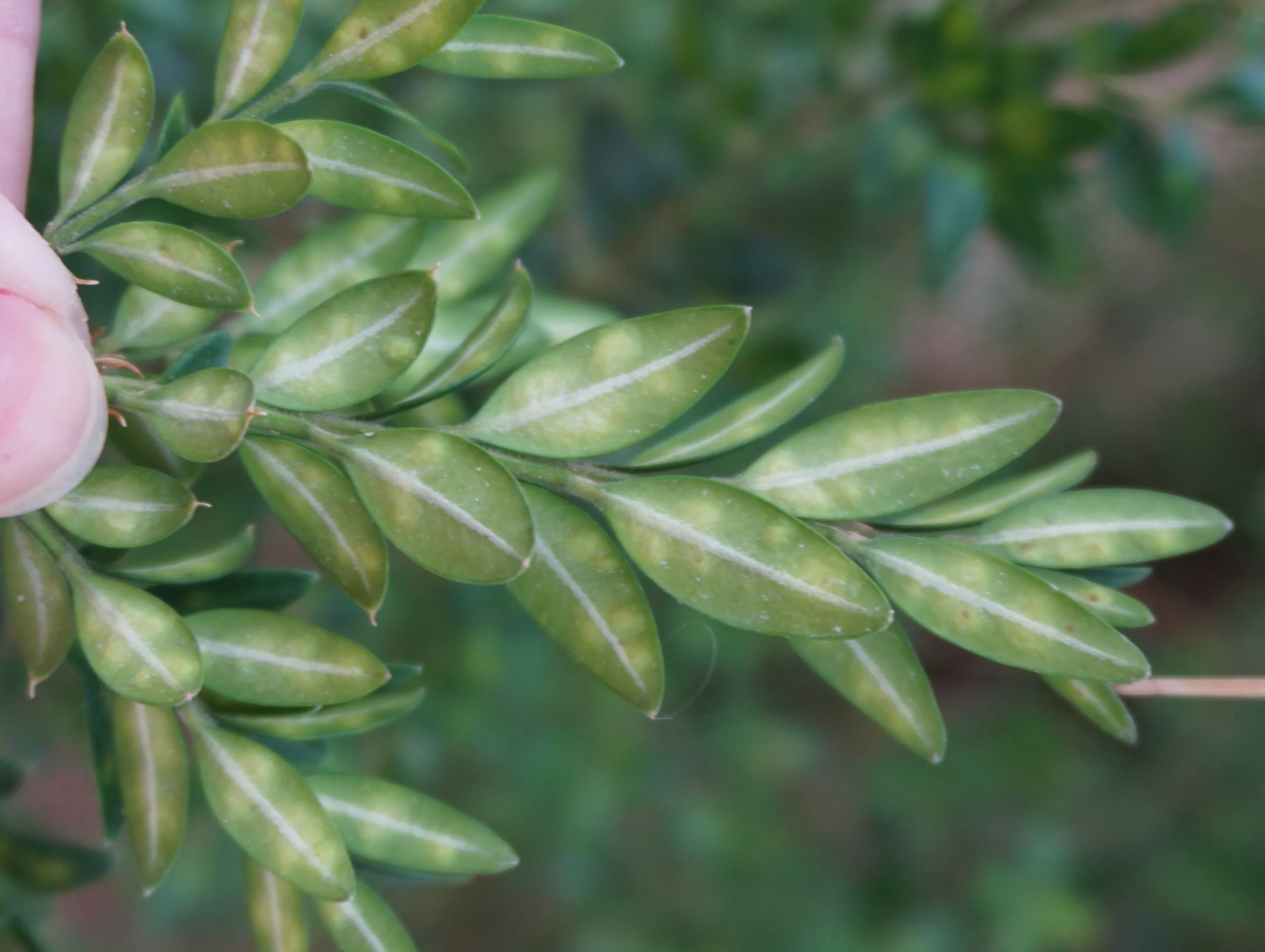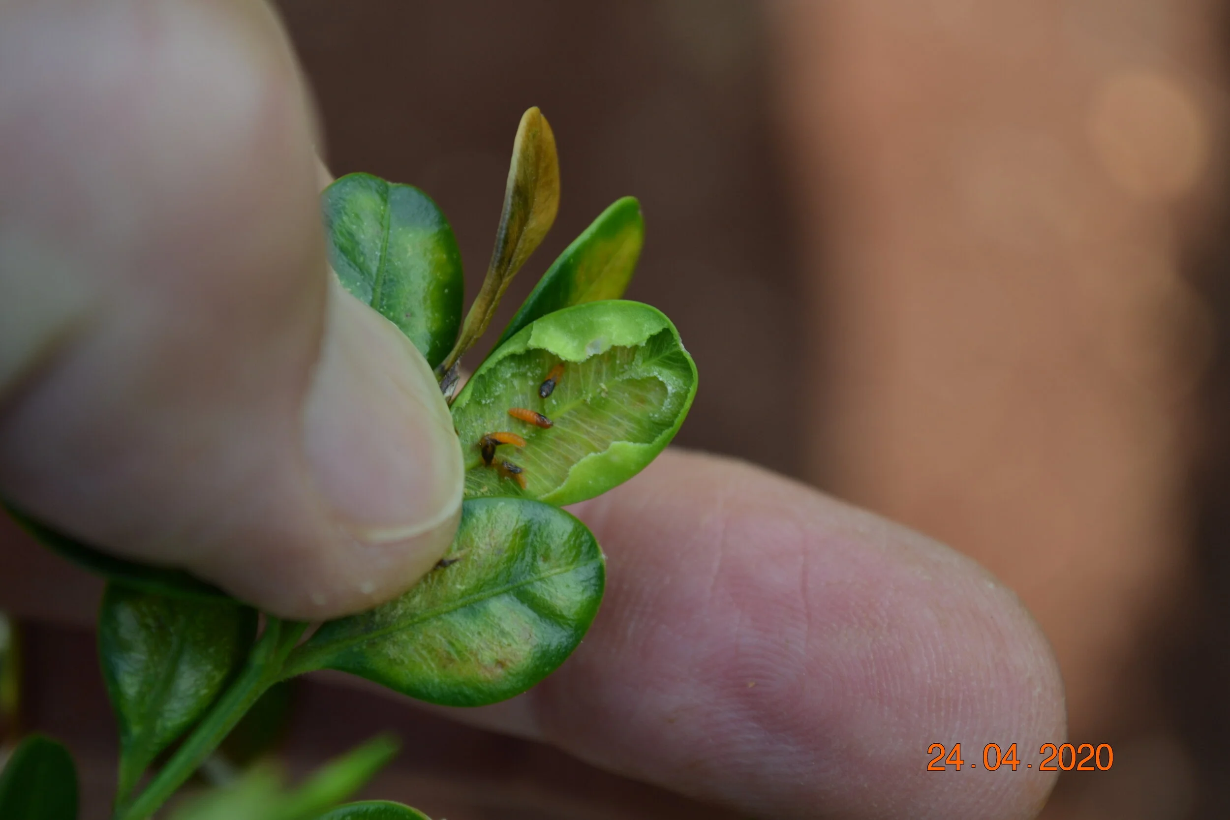 The Boxwood Leafminer is the most damaging insect pest to boxwood in the Mid-Atlantic area of the United States. Technically not a leafminer, but a midge, this pest causes blisters and defoliation that can be quite an eyesore for a boxwood enthusiast. Over a period of several years, a lightly infested plant can become discolored, yellowish-brown, and even defoliate. In rare occasions, severe Boxwood Leafminer populations can kill boxwood. The good news about Boxwood Leafminer is that there are effective control options and those options are simple because there is only one generation of the pest per year.