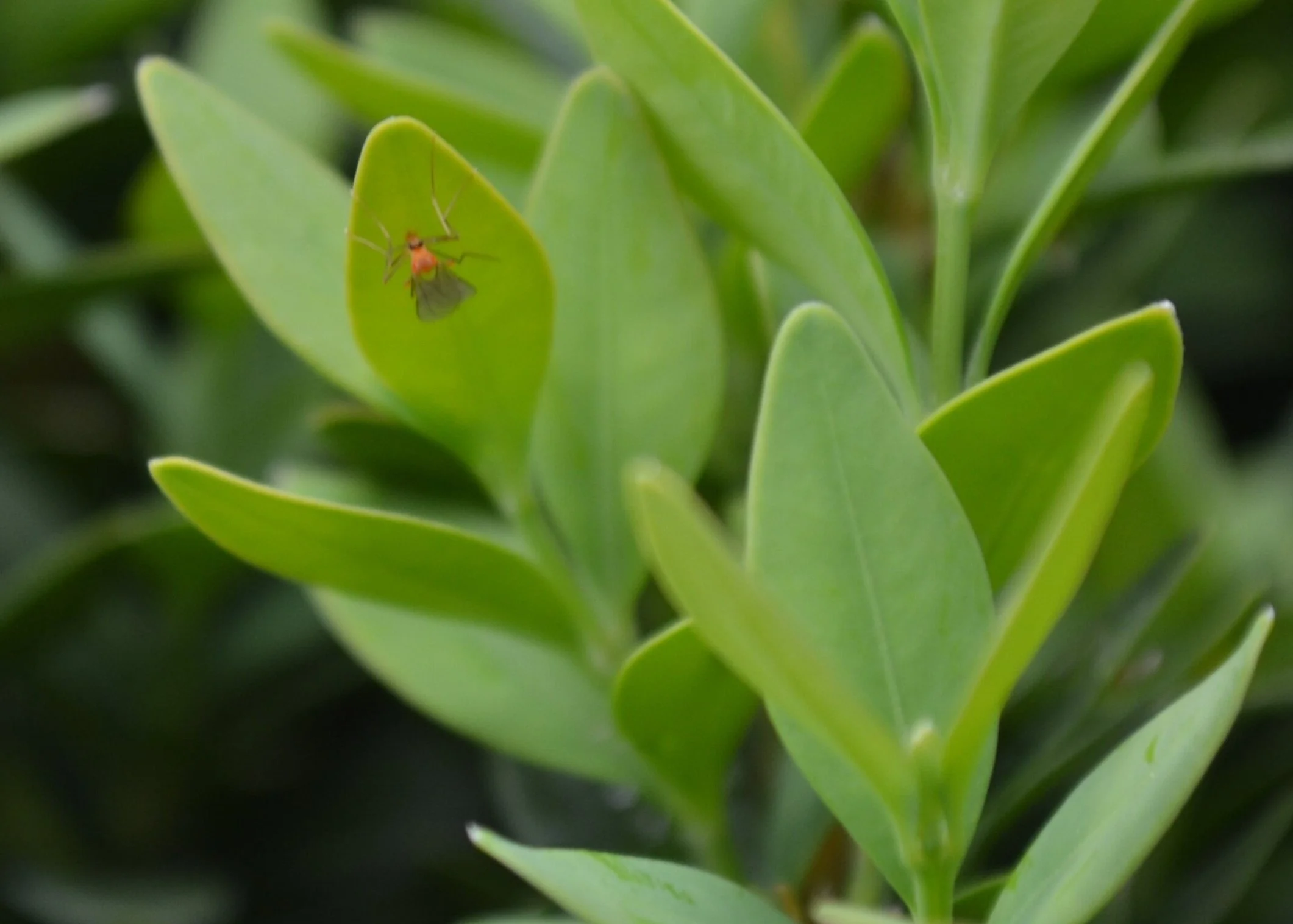 Adult Boxwood Leafminers emerge over a two to three-week period (depending on temperature) in late April to early May in Virginia. To the naked eye, the adult Boxwood Leafminers appears to be a tan or orange gnat-like fly, resembling a small mosquito. The adults live only a week or two and are very weak flyers, generally hovering within inches of a boxwood so that the wind will not blow them away. The adults mate and the female lays eggs in the tender underside of the leaves of the current year’s new growth.