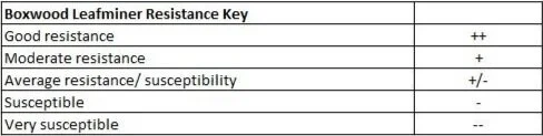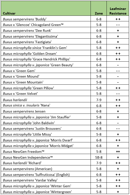 When planting new boxwood, the best strategy is to plant cultivars that are genetically more resistant to the Boxwood Leafminer. Susceptibility of boxwood varieties to Boxwood Leafminer is cultivar-specific. Some boxwood show absolutely no damage at all when subjected to heavy populations of Boxwood Leafminer. Other cultivars show extreme susceptibility. Saunders Genetics has researched more than 150 cultivars of boxwood over the years and have catalogued susceptibility. In the long-term, nurseries and gardeners do not want to spray for insects and diseases. If they plant the right cultivars, they will not have to! The chart below lists common cultivars and their susceptibility to Boxwood Leafminer.