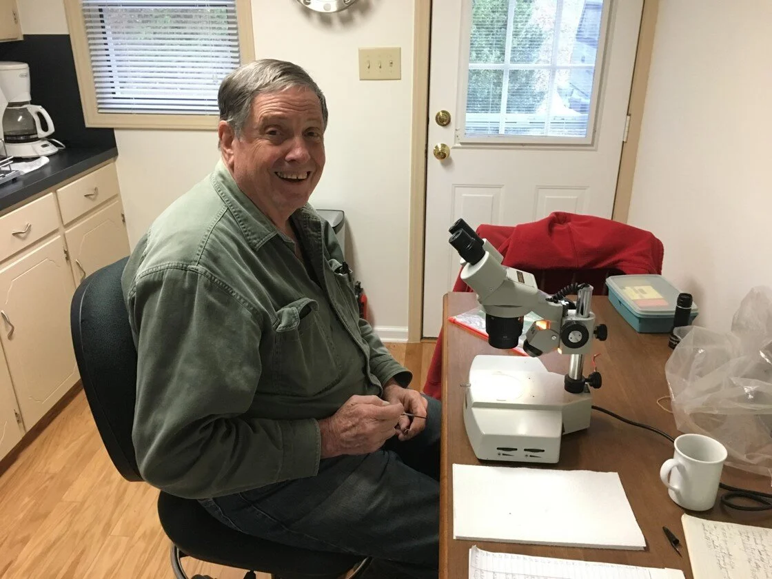 Pictured: Bob Dunn, a researcher with Saunders Genetics looked at over 150 cultivars of boxwood for their Boxwood Leafminer resistance by dissecting thousands of leaves and counting larvae.